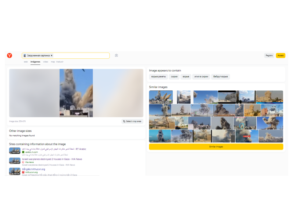 A partir de una captura de pantalla del video que circula en redes, hicimos una búsqueda inversa de imágenes en Yandex y encontramos el mismo video en una publicación en la plataforma en árabe de RT (medio de noticias globales financiado por el Estado ruso) del 13 de mayo de 2023, que señala que ese día un avión del ejército israelí destruyó una casa en la Franja de Gaza.