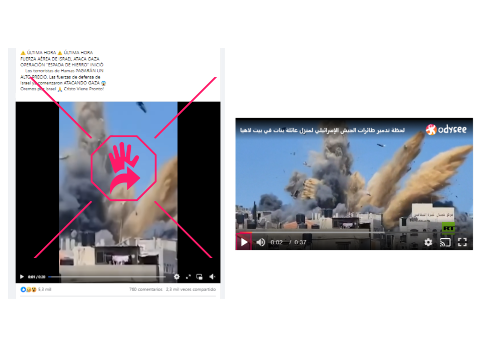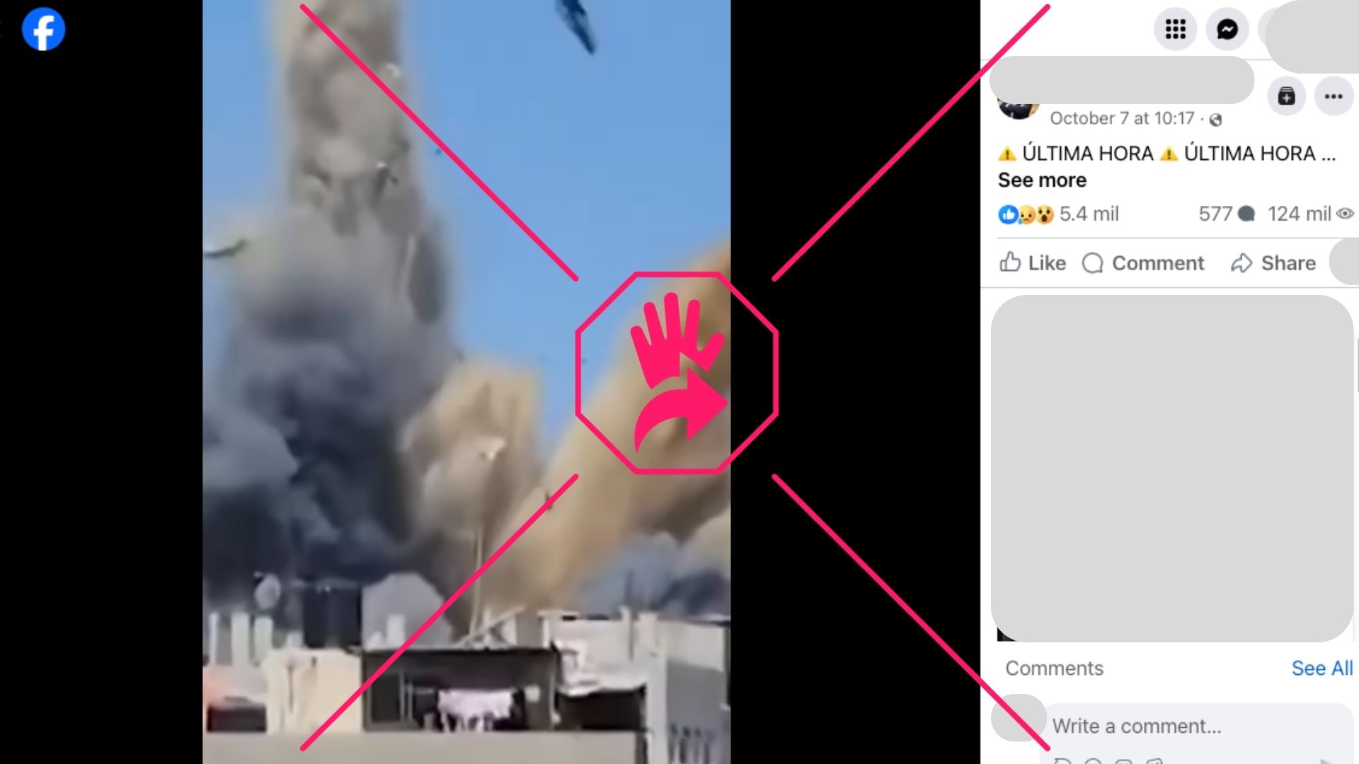 Es falso que el video de una explosión entre edificaciones blancas y grises que circula en Facebook sea de la operación militar israelí en respuesta al ataque terrorista de Hamas del 7 de octubre de 2023. “Última hora. Fuerza Aérea de Israel ataca Gaza. Operación 'Espada de Hierro’ inició”, se lee en el texto de la publicación que hasta este 12 de octubre tenía 124,000 visualizaciones. Pero no es así porque ese video está fuera de contexto, pues la explosión registrada ocurrió hace cinco meses, previo a la guerra entre Israel y Hamas.