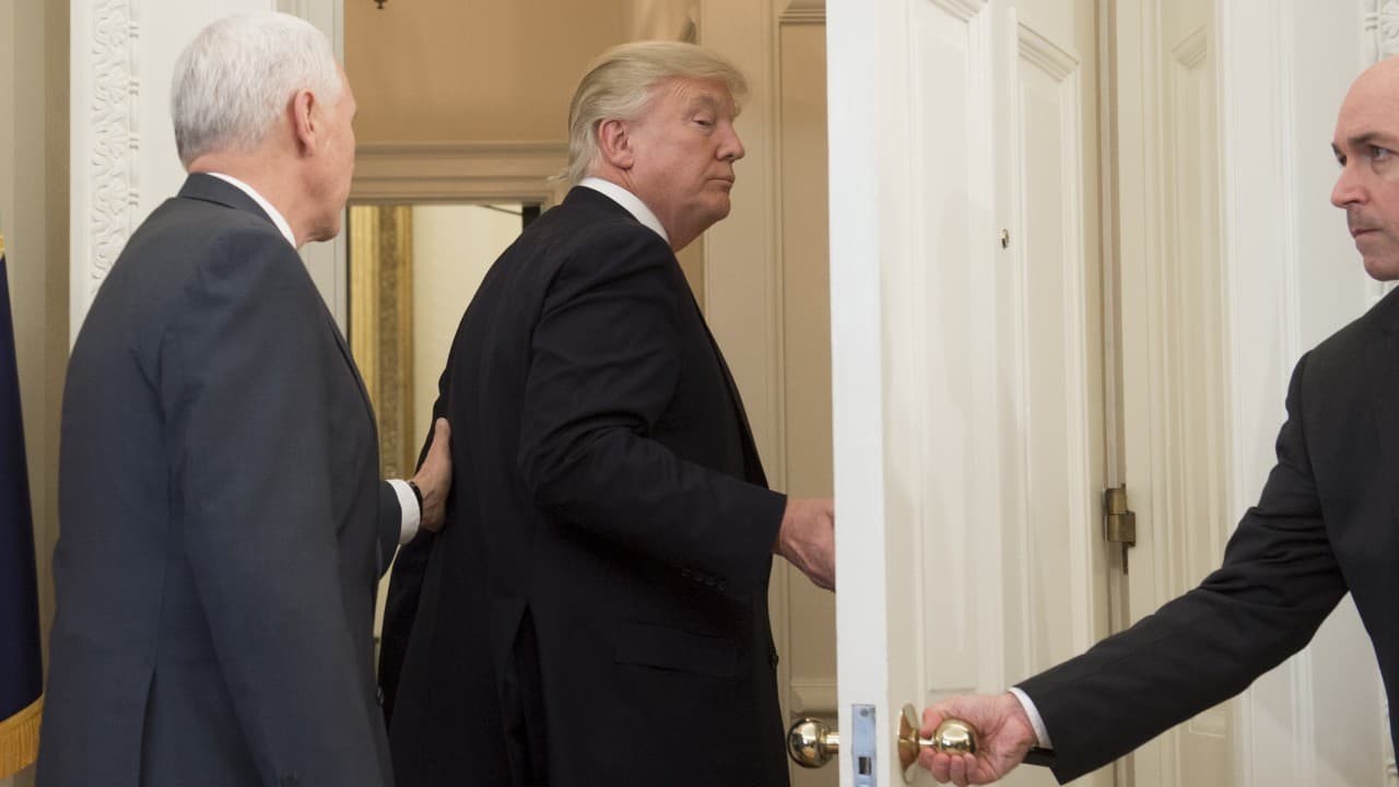 El presidente no firmó las acciones ejecutivas que tenía planteadas para este día del modo que normalmente lo hace, con mucho festejo y con posterior muestra a las cámaras. Esto ocurrió luego que un periodista le hizo algunas preguntas sobre el general Michael Flynn y aparentemente esto lo le gustó al mandatario. Acto seguido decidió abandonar el salón. Finalmente las acciones ejecutivas fueron firmadas en otro sitio sin cobertura de los medios.