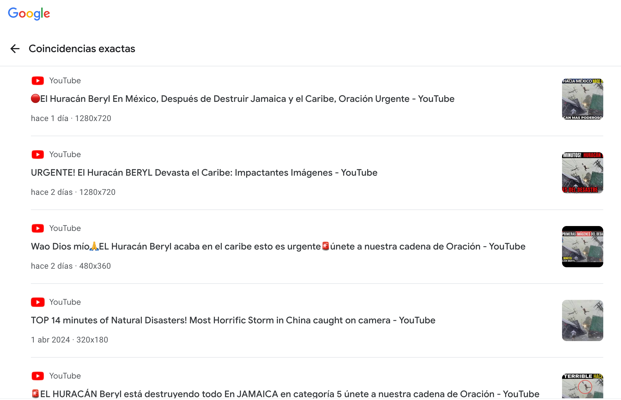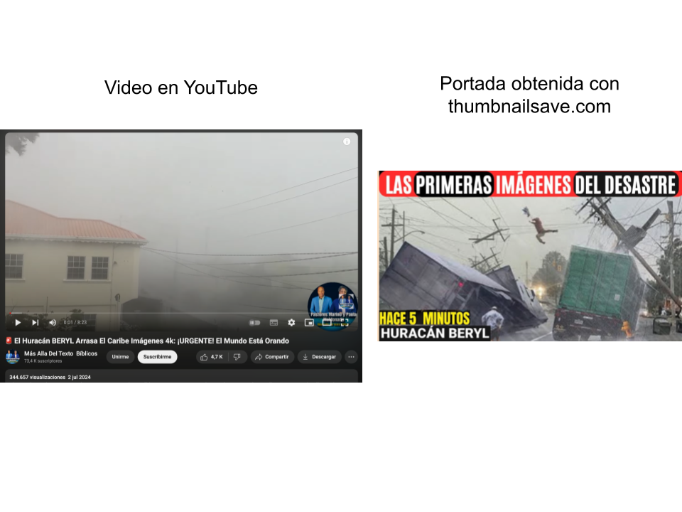 Observamos así que un video con imágenes de Beryl en México, publicado en YouTube el 4 de julio de 2024, utiliza la miniatura, aunque cambiando el texto que aparece sobre ella. Otra grabación toma como referencia esa imagen exacta, solo que la ubica, en general, en “el Caribe”.