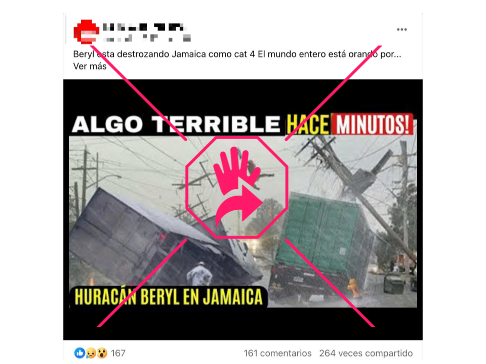 Sobre la imagen puede leerse, en su parte superior, “algo terrible hace minutos”, y en su parte inferior, “huracán Beryl en Jamaica”. El texto que acompaña a la supuesta foto dice que “Beryl está destrozando” esa isla caribeña. Si bien es cierto que el paso de este huracán por el Caribe, incluida Jamaica, está siendo muy destructivo, como informamos en Univision Noticias, la imagen no tiene ninguna relación con los destrozos ocasionados por este.