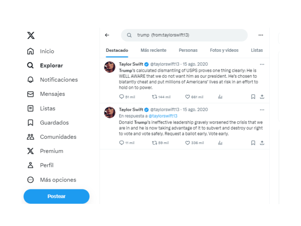 Con una búsqueda avanzada en la cuenta X de la artista, @taylorswift13, encontramos que en agosto de 2020 también dedicó un pequeño hilo (una seguidilla de posts) cuestionando al entonces presidente. “El liderazgo ineficaz de Donald Trump empeoró gravemente la crisis en la que nos encontramos y ahora está aprovechándose de ella para subvertir y destruir nuestro derecho a votar y votar con seguridad. Solicita una boleta anticipada. Vota pronto”, se lee en uno de ellos. En otro señala que Trump “está muy al tanto de que no lo queremos como nuestro presidente”.