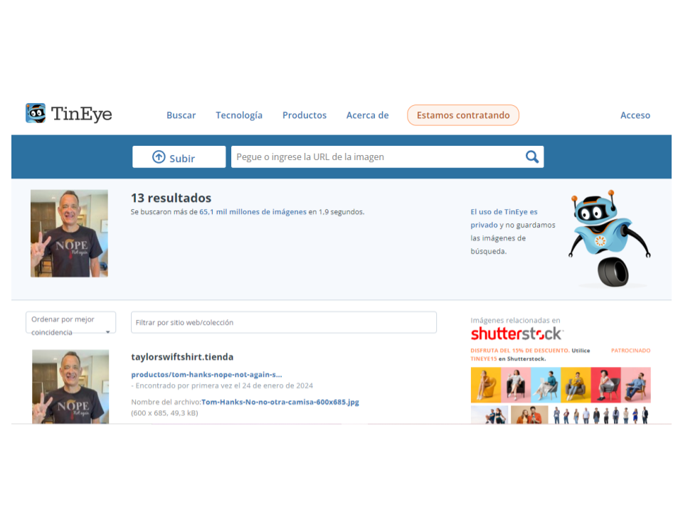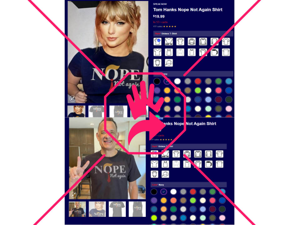 Con una búsqueda inversa de imágenes en TinEye, llegamos a una página identificada como Taylor Swift Shirts en la que venden la playera bajo la descripción “Tom Hanks Nope Not Again Shirt”, sin dar detalles sobre el supuesto uso por parte del actor o de la cantante. Ofrecen diferentes modelos, colores y tallas, pero esa no es la web oficial de mercancía de Taylor Swift. La página oficial es esta y hasta la fecha no aparece ninguna camiseta con un mensaje anti-Trump.