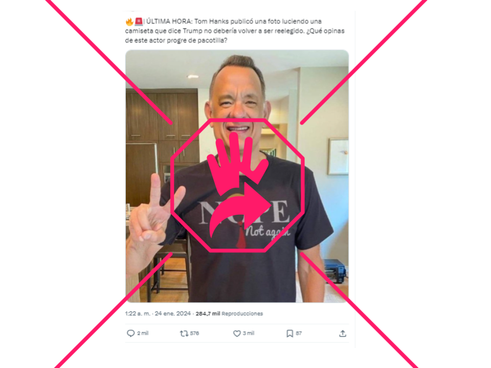 “Tom Hanks publicó una foto luciendo una camiseta que dice Trump no debería volver a ser reelegido”, se lee en una publicación en X, que para el 29 de enero de 2024 alcanzó más de 284,700 reproducciones y 3,000 “me gusta”, pero no es así. Desde elDetector revisamos la cuenta en Instagram del actor de Hollywood y no hay ninguna foto de él usando esa playera. La cuenta oficial en Facebook de Tom Hanks, donde tiene más de 12 millones de seguidores, no hace publicaciones desde 2020. Tampoco aparece en su página web.