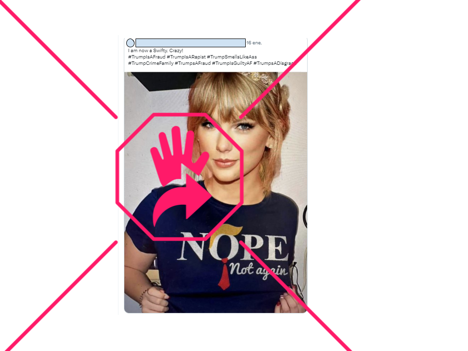 Tal como dijimos, en YouTube y también en inglés en X circula una imagen de la cantante Taylor Swift con una franela azul marino y el mensaje “Nope, not again”. Ni en su cuenta en Instagram ni en su página oficial en Facebook, ni tampoco en su cuenta en X, hay registro de que haya publicado una foto con esa camiseta anti-Trump.