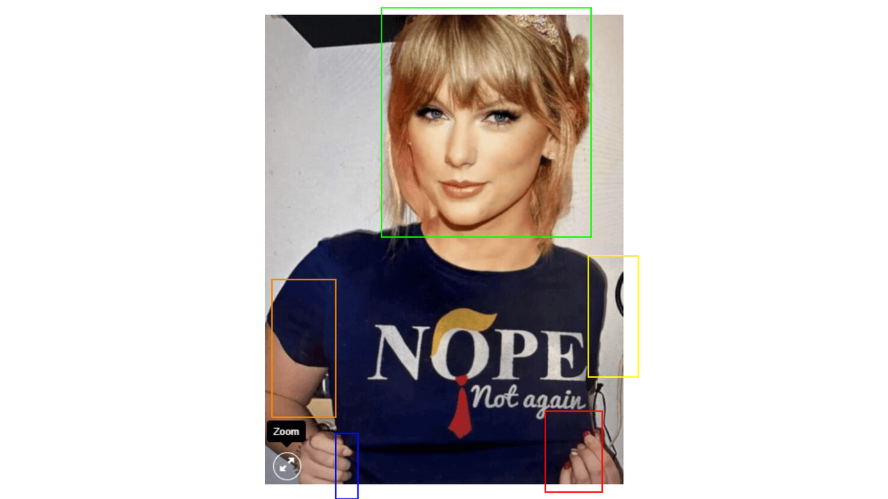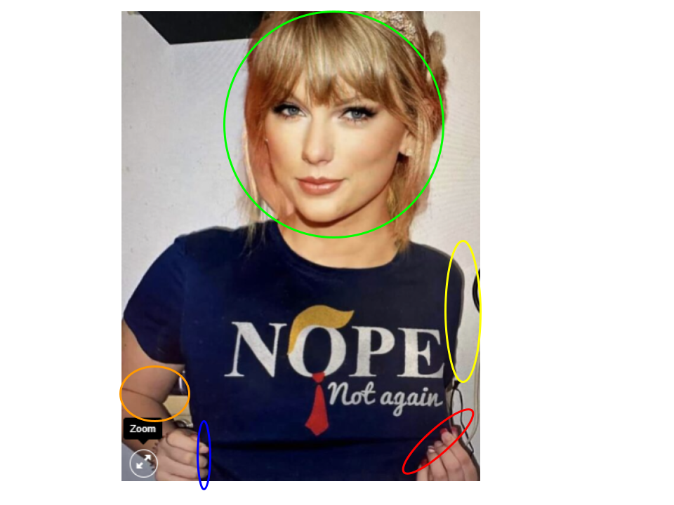 Asimismo, en otra versión de la imagen que usan de la cantante con la supuesta camiseta anti-Trump en la página no oficial de playeras, la cabeza parece más grande que el cuello (recuadro verde), no se le ve el brazo izquierdo (recuadro amarillo), pero sí una mano con uñas rojas (recuadro rojo), y el brazo derecho es pequeño en proporción al resto del cuerpo (recuadro naranja), además de que esa mano no tiene las uñas pintadas de rojo como la otra y la contextura de los dedos es diferente (recuadro azul).