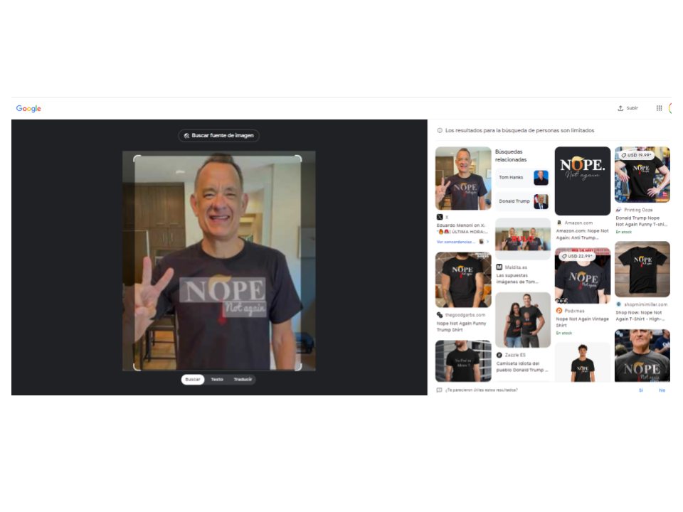 Son falsas esas fotos del actor Tom Hanks y la cantante Taylor Swift en las que se les ve usando una playera con el mensaje anti-Trump de “No, no de nuevo” (“Nope, not again”) . Las imágenes muestran inconsistencias y pequeñas imperfecciones propias de creaciones con inteligencia artificial o manipulaciones digitales. En el caso de Hanks, no hay rastro de una foto original donde esté usando la camiseta, y ya en el pasado la figura del actor fue utilizada para desinformaciones generadas mediante IA. Por su parte, el rostro original de una foto de Swift en 2019 parece haber sido puesto en una creación digital para que simulara usar la franela con el mensaje en contra del expresidente republicano Donald Trump. Además, una de las publicaciones en redes dirige a una página de venta de productos que no es la oficial de la cantante. Lee aquí cómo escogemos y asignamos nuestras etiquetas en elDetector.