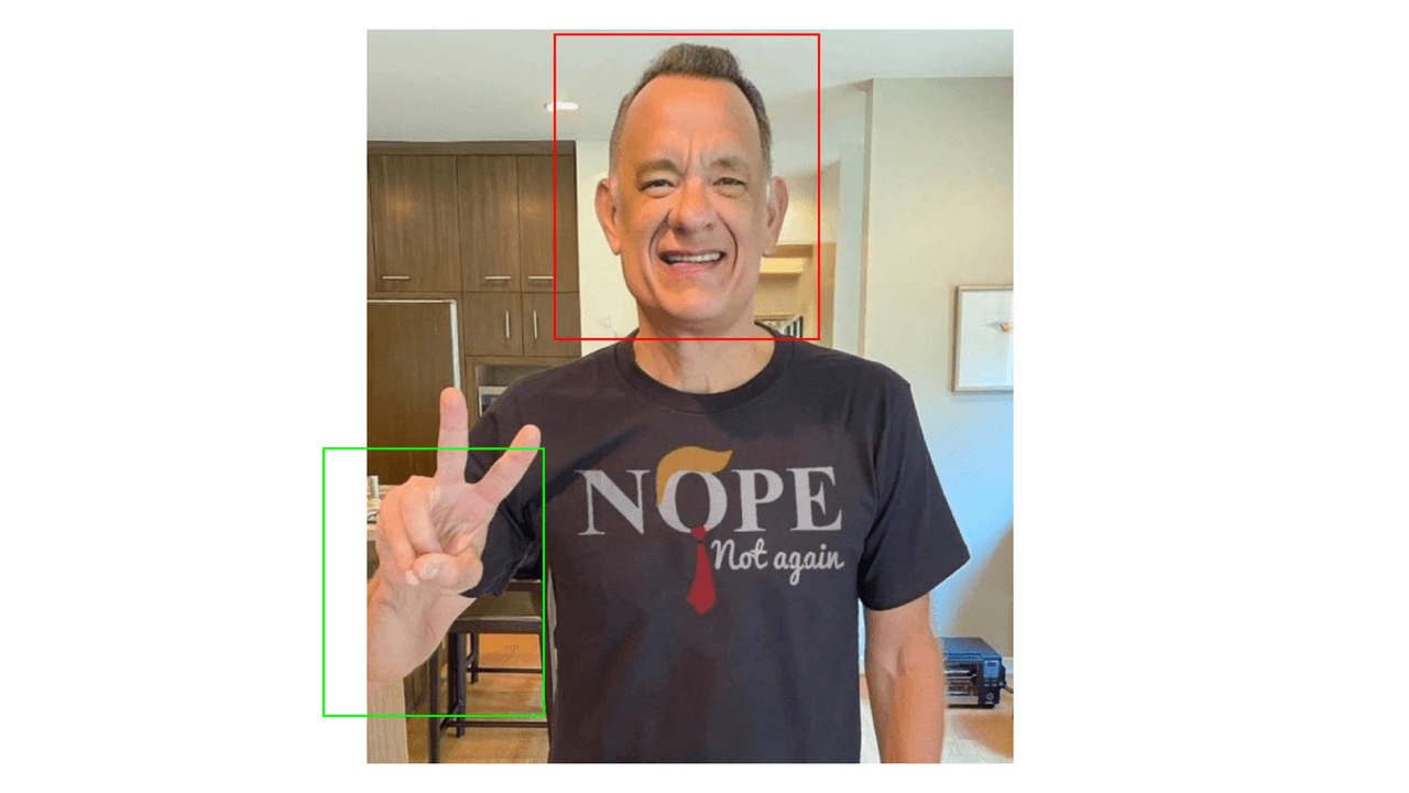 En la imagen que circula en redes detallamos que la mano de Hanks está interrumpida (ver recuadro verde), como si una mano saliera de otra y no de su propio brazo, y su cara luce más tersa (recuadro rojo) que como se ha visto al actor en sus más recientes presentaciones públicas o en sus publicaciones en Instagram. Estos son detalles que parecen indicar que fue creada con IA o manipulada digitalmente.