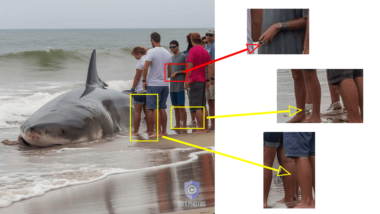 Es falso que ese “gran tiburón blanco gigante” apareciese varado en una de las playas de los Outer Banks, en Carolina del Norte, como dice un texto que acompaña a cinco supuestas fotos del animal. En elDetector nos confirmaron las autoridades marítimas locales de la zona que no hay noticia de tal suceso. Además, todas las imágenes fueron catalogadas con un alto porcentaje de ser artificiales al pasarlas por un programa de detección de fotos creadas por IA y varias de ellas tienen errores comunes en estas creaciones, como manos con menos de cinco dedos y piernas adicionales a la cantidad de personas que vemos en una de las imágenes. Lee aquí cómo escogemos y asignamos nuestras etiquetas en elDetector.