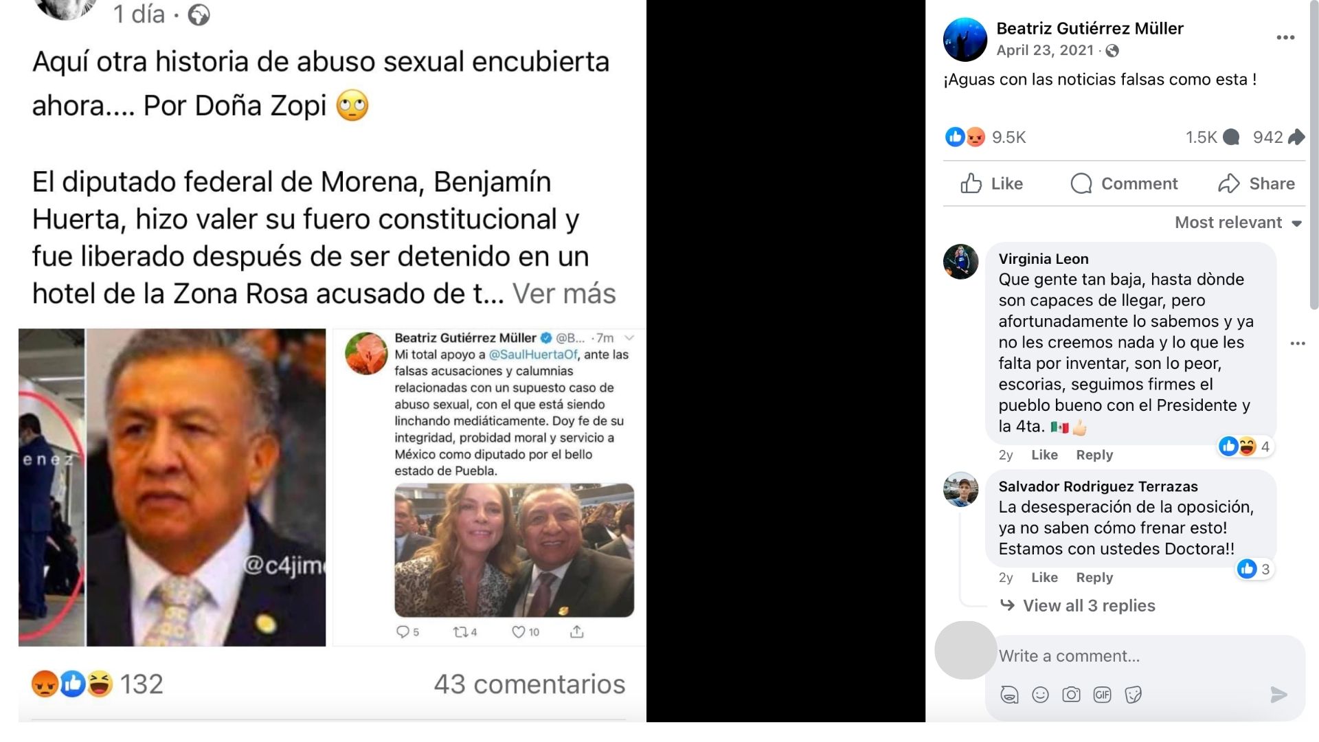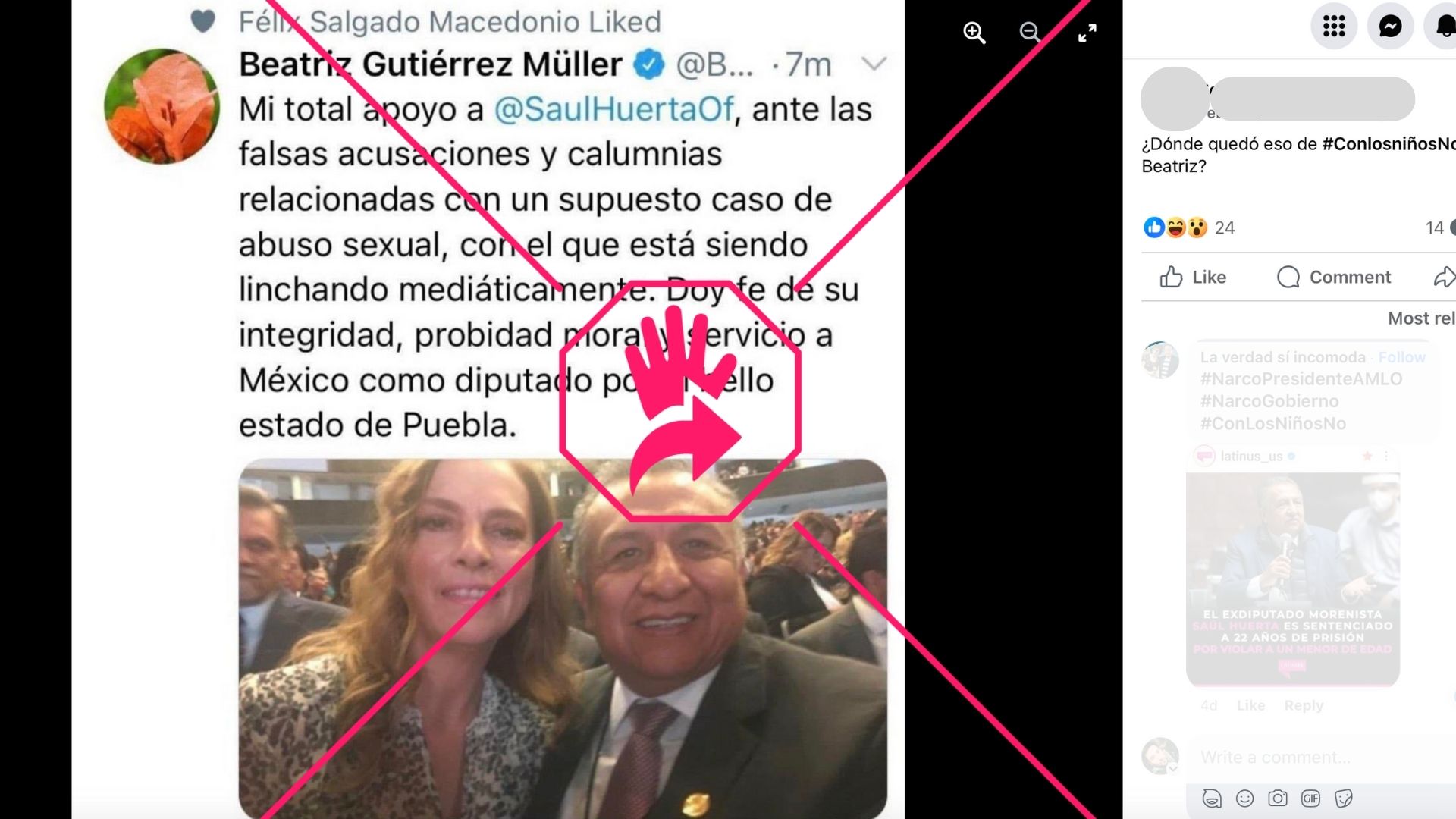 Es falso que Beatriz Gutiérrez Müller, esposa del presidente mexicano, Andrés Manuel López Obrador, publicó ese tuit defendiendo a Saúl Huerta, exlegislador federal recientemente sentenciado por la violación de un menor de edad en México, como muestra una imagen que aparece en publicaciones en Facebook y en X (antes Twitter). La propia Gutiérrez Müller lo desmintió en su página oficial de Facebook en abril de 2021, tras el primer arresto del exlegislador. Pero la falsedad ha vuelto a circular desde entonces.