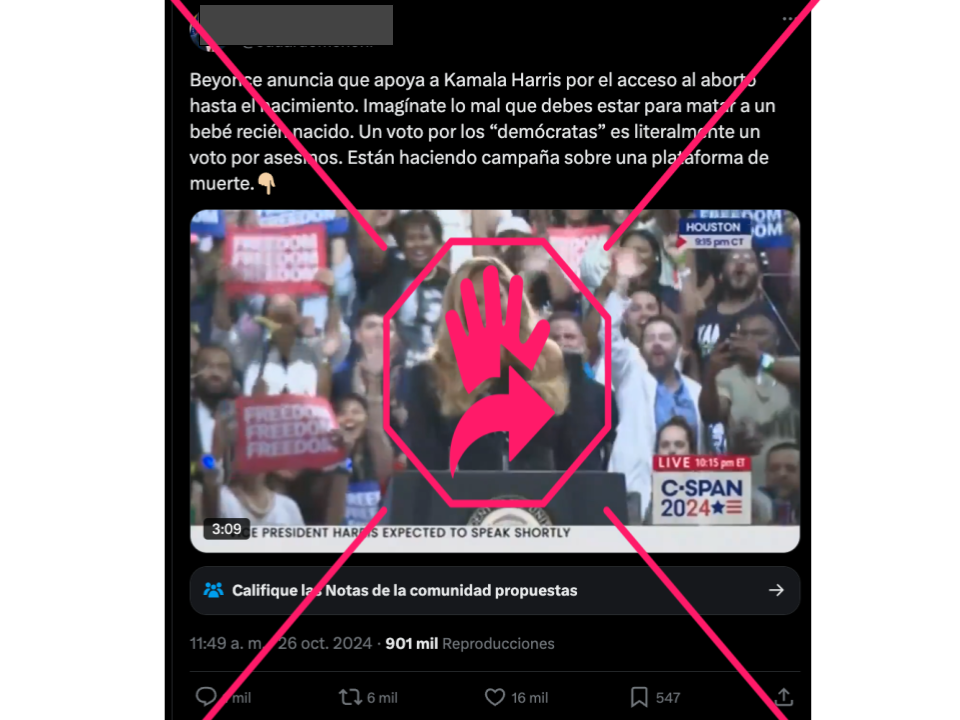 “Beyoncé anuncia que apoya a Kamala Harris por el acceso al aborto hasta el nacimiento. Imagínate lo mal que debes estar para matar a un bebé recién nacido. Un voto por los ‘demócratas’ es literalmente un voto por asesinos. Están haciendo campaña sobre una plataforma de muerte”, dice una publicación que hasta el 29 de octubre se ha compartido 6.000 veces en X (antes Twitter) y que incluye un video de la cantante en el mitin de Harris.