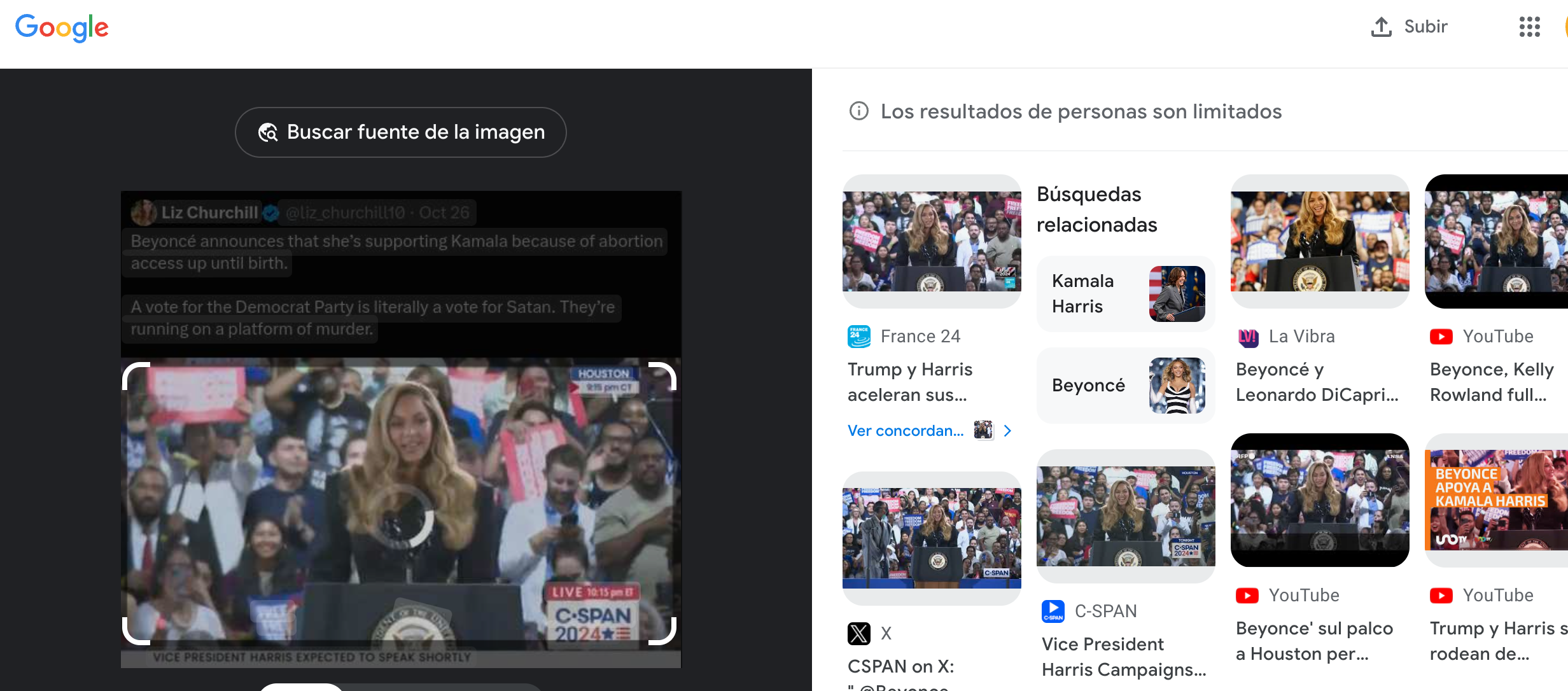 En elDetector hicimos una búsqueda inversa de imágenes en Google y uno de los resultados que nos arrojó fue un video de C-SPAN publicado el 25 de octubre de 2024 titulado: “La vicepresidenta Harris hace campaña en Houston, Texas, con Beyoncé”.