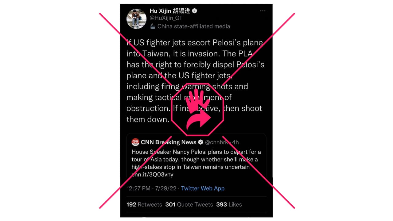 En redes sociales se ha hecho viral una supuesta amenaza de China de derribar el avión en el que viajó la presidenta de la Cámara de Representantes a Taiwán. Pero aunque el gobierno chino ha advertido que la visita de Nancy Pelosi traerá consecuencias, la sugerencia de tumbar la aeronave no provino de un funcionario, sino de un columnista de un medio ligado al Partido Comunista Chino.