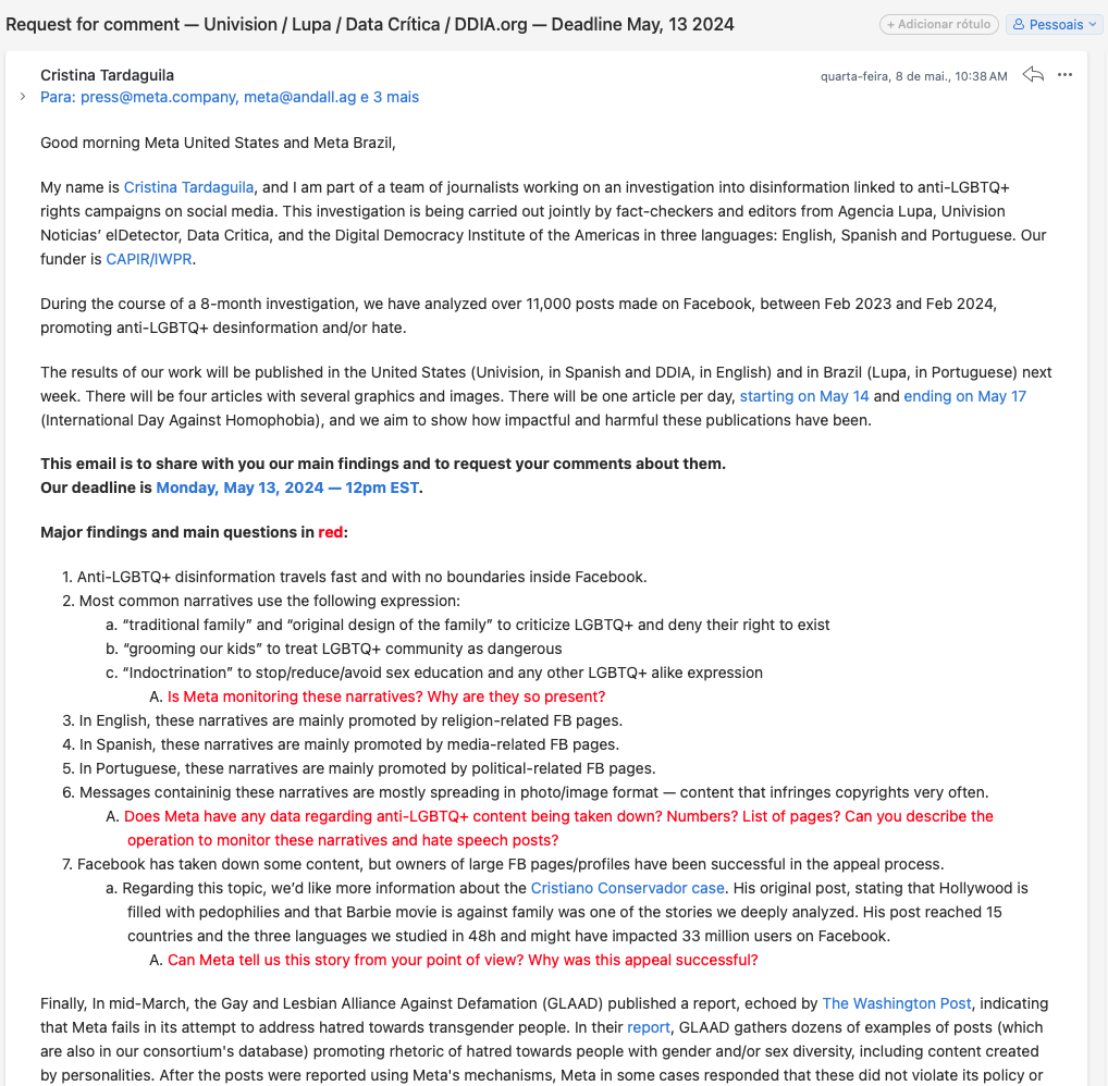 Para los temas tratados en esta serie de reportajes, se contactó a Meta y un portavoz contestó vía correo electrónico: "Meta no permite el discurso de odio en sus plataformas y los estándares de la comunidad prohíben cualquier contenido que ataque a las personas en función de sus características. Esto incluye etnia, nacionalidad, religión u orientación sexual, clase social, género, identidad de género, enfermedad o discapacidad. Revisamos el contenido mediante una combinación de tecnología de inteligencia artificial y equipos humanos. También alentamos a las personas a reportar contenido y cuentas que crean que violan nuestras políticas a través de las herramientas disponibles dentro de las aplicaciones mismas".