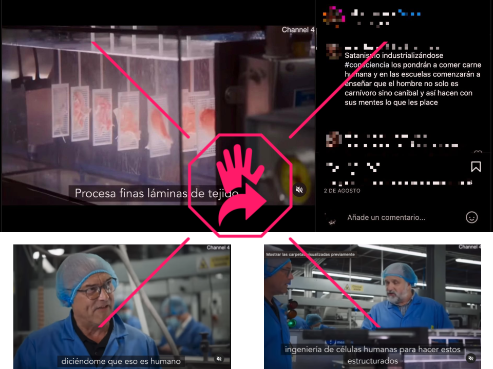 “Satanismo industrializándose #consciencia los pondrán a comer carne humana y en las escuelas comenzarán a enseñar que el hombre no solo es carnívoro sino canibal [sic] y así hacen con sus mentes lo que les place”, dice el texto que acompaña el video, de 1 minuto y 26 segundos de duración.