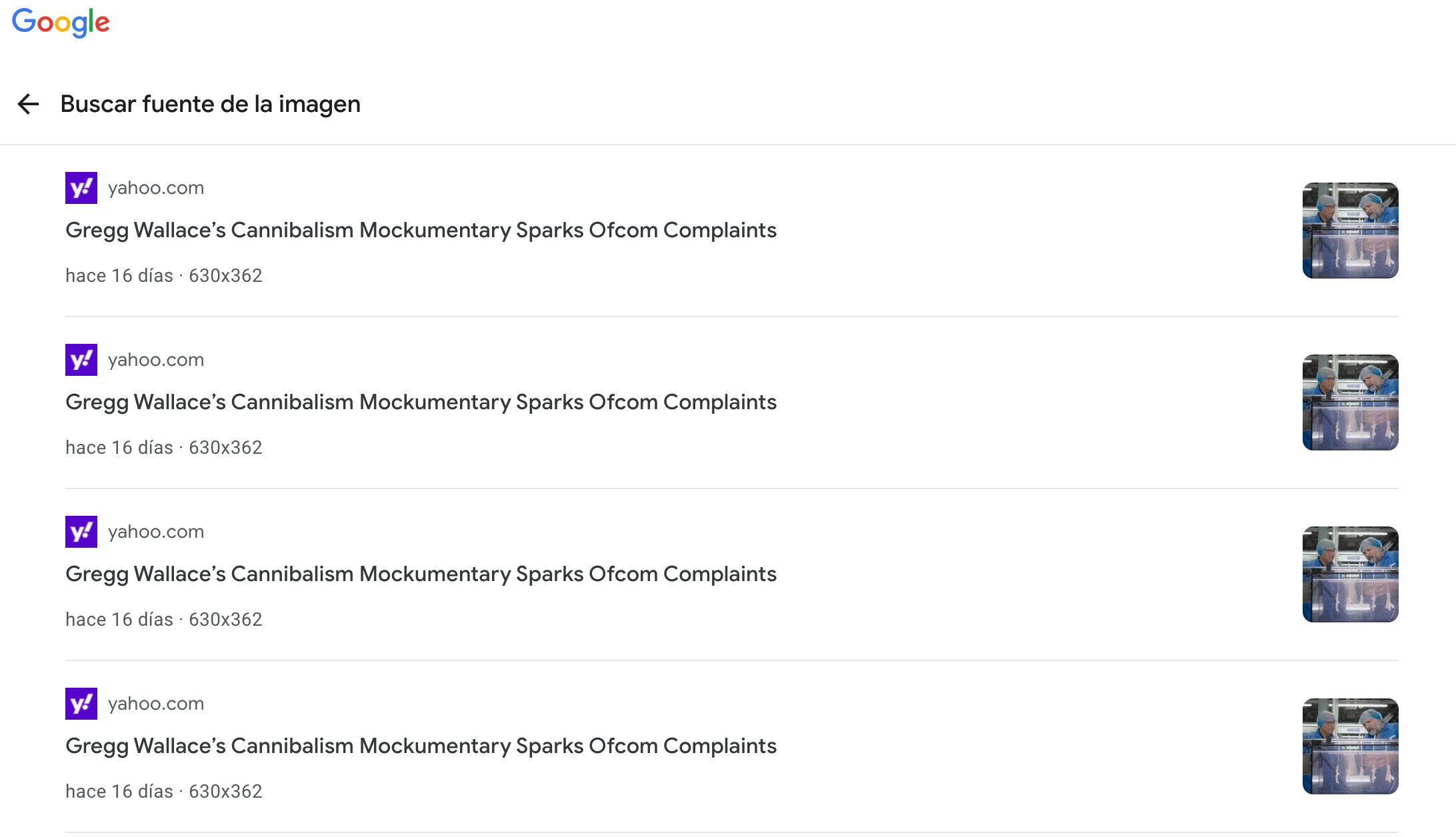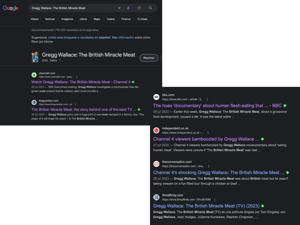Una búsqueda inversa de imagen en Google, a partir de una captura de la grabación, facilita una publicación en la web de Yahoo! en la que aparece la imagen de las dos personas frente al supuesto tanque de ‘creación’ de los filetes. El título del texto es: “El falso documental sobre canibalismo de Gregg Wallace suscita quejas de Ofcom”. Ofcom es como se conoce a la oficina del defensor del televidente en el Reino Unido. Ese “falso documental” se titula: “Gregg Wallace: The British Miracle Meat” (Gregg Wallace: La carne milagrosa británica).