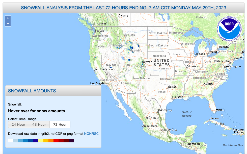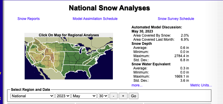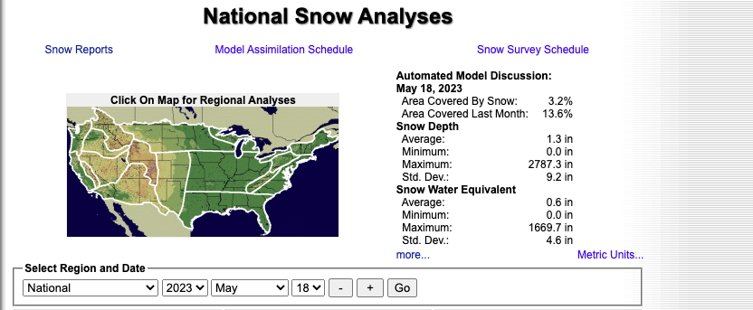 Otra herramienta de análisis nacional de nieve indica que, desde el 18 de mayo hasta el 30 de mayo de 2023, el porcentaje de territorio estadounidense cubierto por nieve se ha ido reduciendo de 3.2% a 2%.