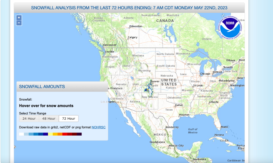 Servicio Nacional de Meteorología. Análisis de caída de nieve 22 de mayo de 2023 y 72 horas anteriores. Consultado el 22 de mayo de 2023.