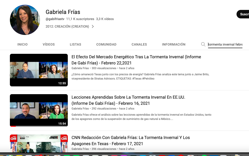Una vez en ese canal de YouTube, en elDetector hicimos una nueva búsqueda por palabras clave (tormenta invernal febrero) y encontramos varios reportes de Frías para CNN sobre la tormenta invernal que azotó Estados Unidos en febrero de 2021. Entre ellos, un clip de 5:30 minutos de duración que consiste en una entrevista con la experta en energía Miriam Grunstein y corresponde con lo que muestra el video objeto de esta verificación a partir del minuto 8:39.