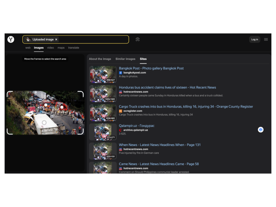 Una búsqueda inversa de imágenes en Yandex de la foto del autobús amarillo revela que el choque ocurrió, en realidad, en Honduras en febrero del 2017. Es decir, hace más de siete años. Fox News cubrió el hecho, que dejó 15 fallecidos, y en la leyenda de la fotografía que ilustra la información, que es del mismo suceso pero hecha desde otro ángulo, se facilita el nombre de la persona que la hizo: Fernando Antonio, para la agencia de noticias estadounidense AP.