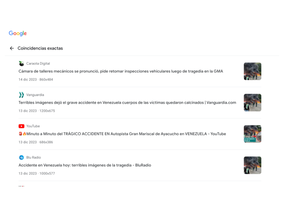 En cuanto a la segunda imagen, en la que se ve un autobús en llamas, una búsqueda inversa de la imagen en Google Lens devuelve varias publicaciones que ubican la fotografía a las afueras de Caracas, capital de Venezuela, a mediados de diciembre de 2023. Es decir, hace 8 meses. Según los reportes, fallecieron al menos 30 personas.