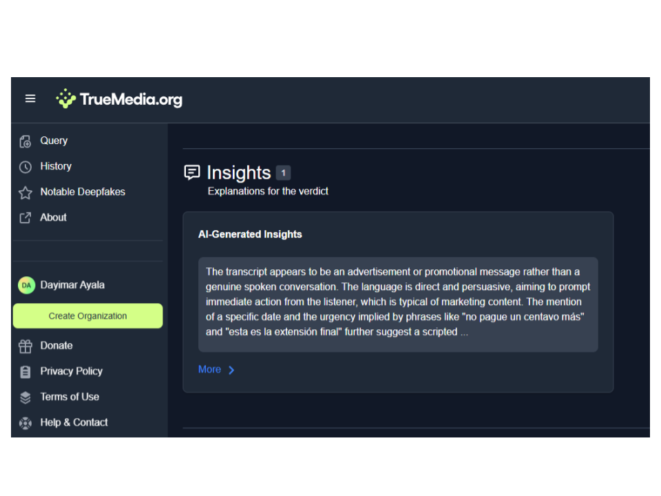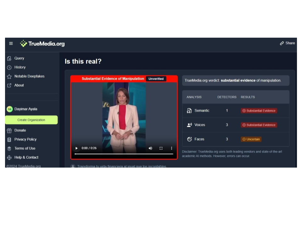 En la grabación se aprecia a simple vista que los gestos y la expresión de la boca de Calderón no coinciden con lo que se dice. Al escanear con TrueMedia, una herramienta gratuita de detección de IA, el video que circula en Instagram, el análisis resultante arrojó evidencia sustancial de manipulación en la voz y el contenido semántico (lenguaje).