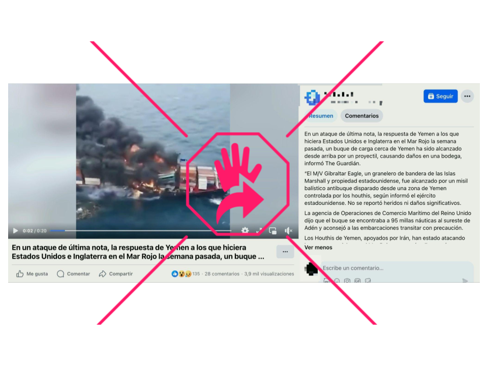 La publicación señala que el buque que se ve en las imágenes es el “M/V Gibraltar Eagle, un granelero de bandera de las Islas Marshall y propiedad estadounidense” que “fue alcanzado por un misil balístico antibuque disparado desde una zona de Yemen controlada por los houthies [hutíes], según informó el ejército estadounidense”. Luego añade que no se reportaron “heridos ni daños significativos”. Lo que señala el texto es cierto, y así fue confirmado por el Mando Central del Ejército de los Estados Unidos el 15 de enero, solo que no tiene nada que ver con la grabación que lo acompaña.