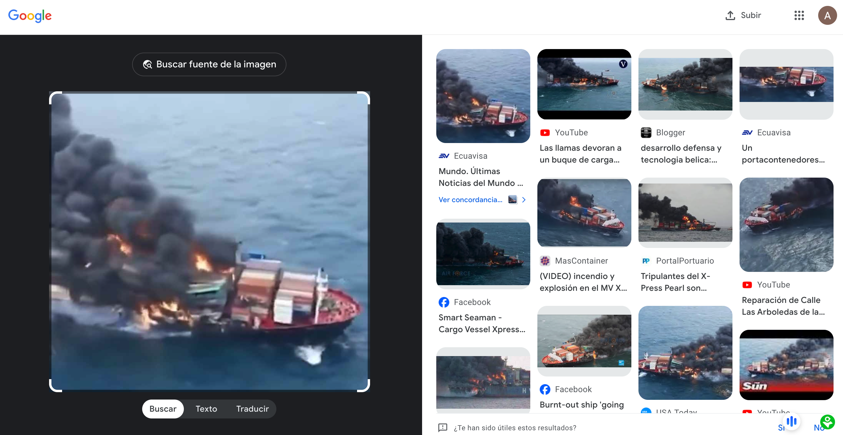 Una búsqueda inversa de imagen en Google, a partir de una captura del video, arroja una información del medio español La Vanguardia, fechada el 26 de mayo de 2021, en la que aparecen imágenes similares a las analizadas y de las que dice pertenecen a “un grave incendio” en un buque de carga “repleto de contenedores cerca de la capital de Sri Lanka, Colombo”.