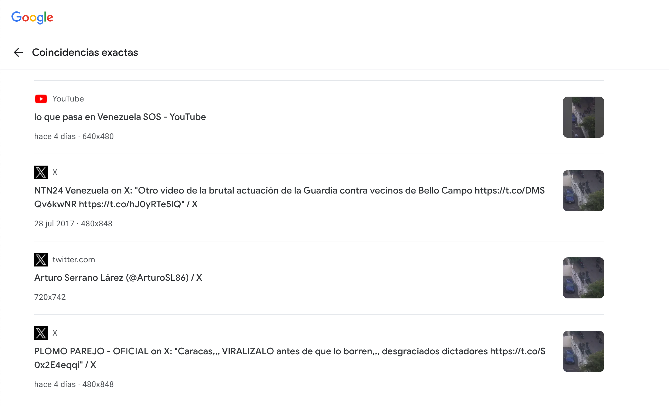 Una búsqueda inversa de imágenes en Google Lens con una captura de pantalla del video que circula en redes sociales da varios resultados que ubican la grabación en julio de 2017, en Caracas, capital de Venezuela.