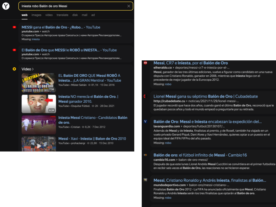 Búsqueda con las palabras clave “Iniesta robo Balón de Oro Messi” en Google, Yandex y Bing. 3 de octubre de 2023.