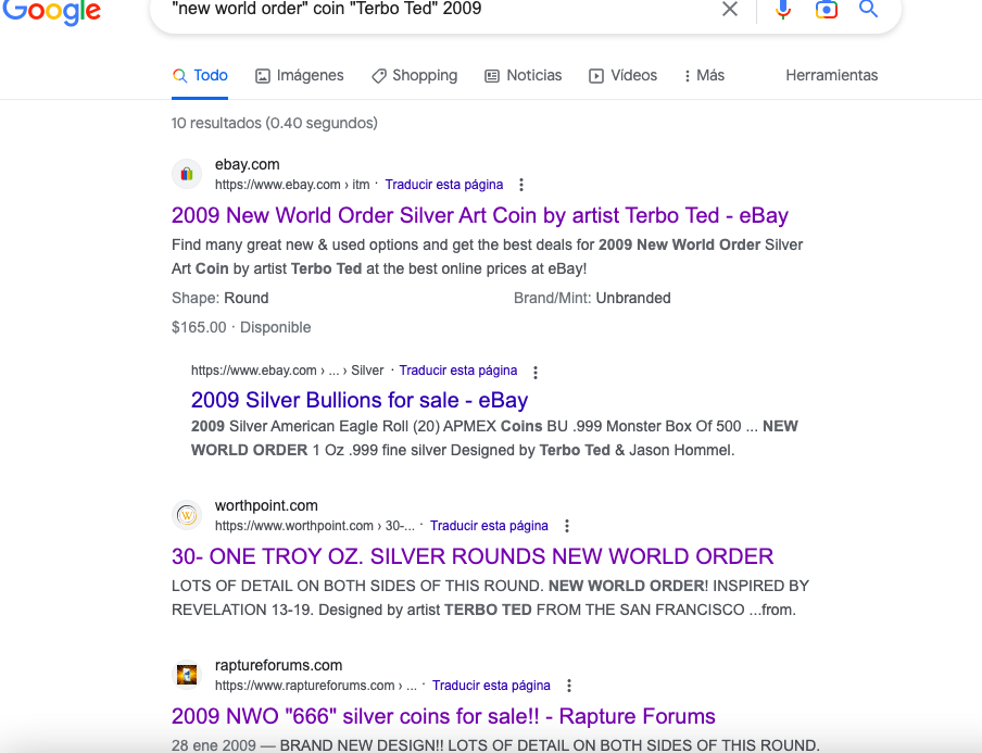 Una venta activa para abril de 2023 en eBay explica que se trata de una “moneda artística de plata del Nuevo Orden Mundial de 2009”, diseñada por el californiano Terbo Ted e inspirada en el "Apocalipsis 13-19” de la Biblia. Y una búsqueda por palabras clave en Google nos lleva a otro sitio de subastas en el que también se menciona a Terbo Ted como creador de la pieza.