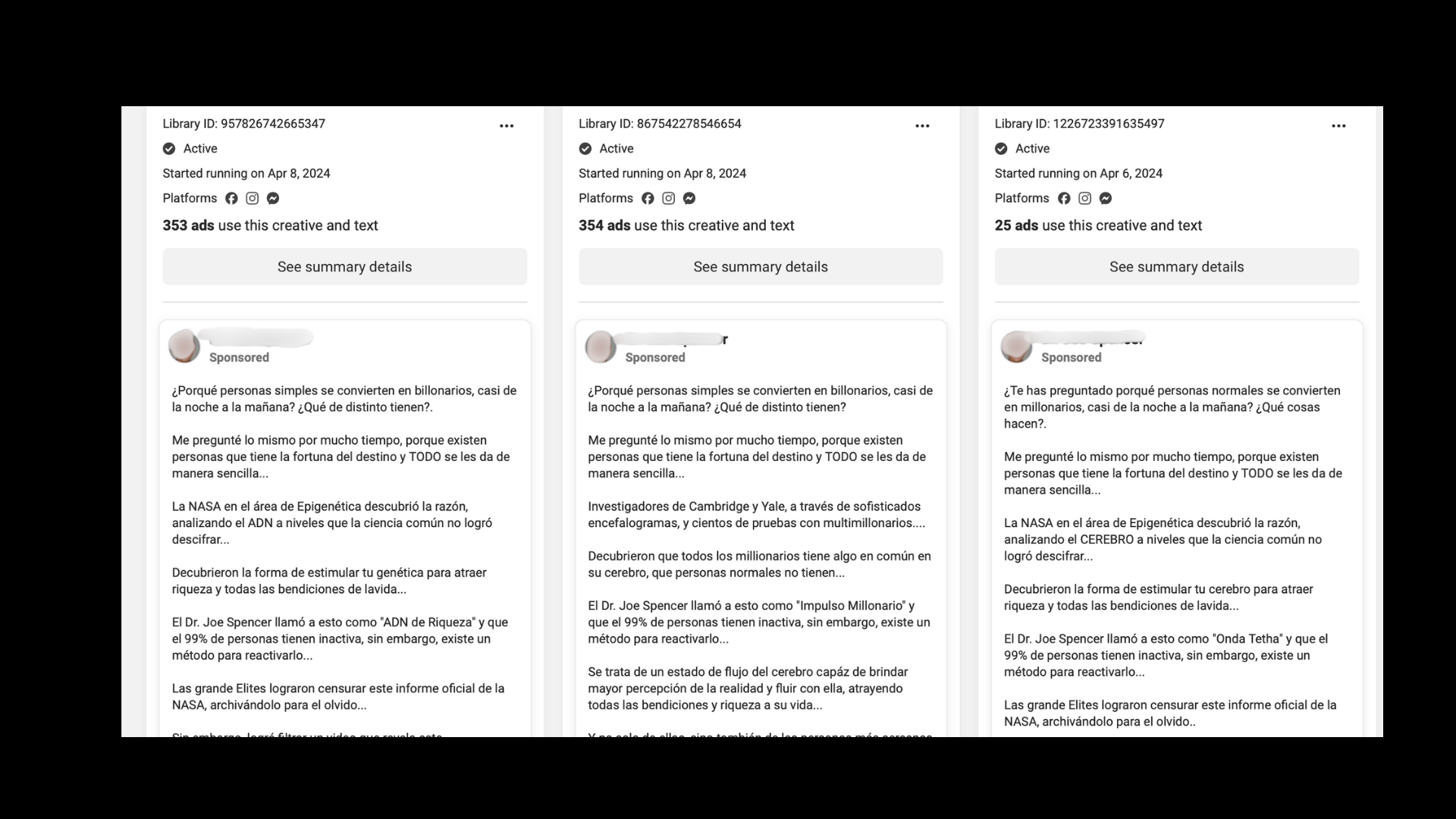 Los textos que utilizan en estos anuncios son bastante parecidos al del post que estamos verificando, pero cambian la entidad a la que le atribuyen el supuesto descubrimiento. Por ejemplo, identificamos que en el mensaje de una de las publicaciones decía que los autores del “hallazgo” fueron "investigadores de Cambridge y Yale”.