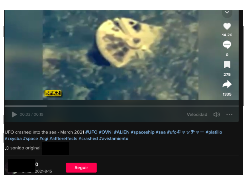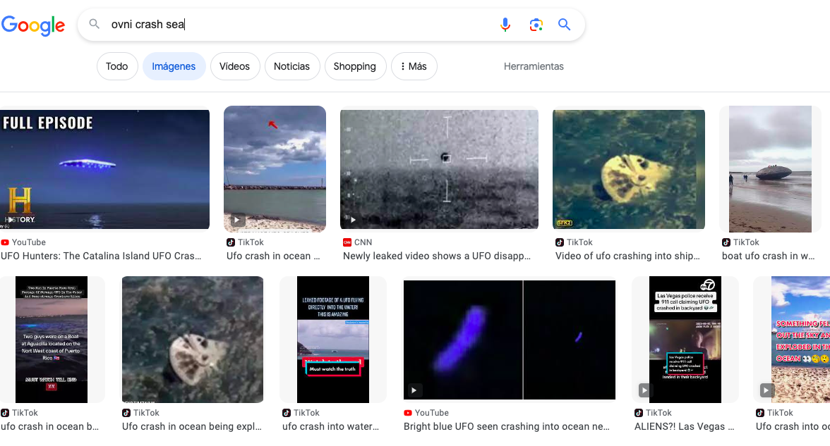 Además, mediante otra búsqueda en Google, en este caso de palabras clave (ovni crash sea), también encontramos publicaciones anteriores de TikTok en las que se muestra el mismo video y que igualmente aseguran que se trata de un supuesto ovni estrellado en el mar.