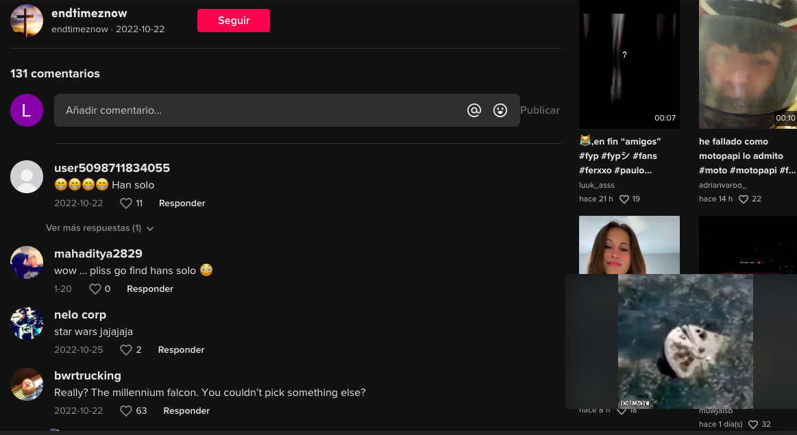 Sin embargo, en uno de esos posts de TikTok (publicado en 2022) varios usuarios advierten que lo que se ve en las imágenes es la nave ficticia de Star Wars. Mientras que en otra publicación, de 2021, se incluyen las etiquetas “aftereffects” (nombre de un programa de animación y efectos especiales) y “cgi” (siglas en inglés de imagen generada por computadora), lo que apunta a que se trató de un ejercicio de animación.