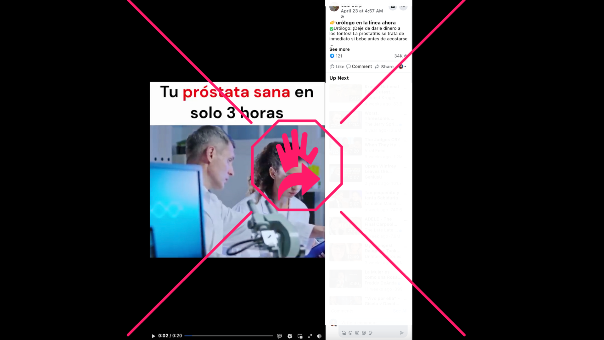 “¡Deje de darle dinero a los tontos! La prostatitis se trata de inmediato si bebe antes de acostarse”, dice el mensaje que acompaña un video de 20 segundos de duración que anuncia que la próstata se puede sanar “en solo 3 horas” con una supuesta “fórmula natural producida por científicos de Oxford”. El clip publicado el 23 de abril de 2023 muestra imágenes que incluyen personas con batas blancas, algunas de ellas en un laboratorio, así como a otras que parecen practicar un procedimiento médico, además de medicamentos.