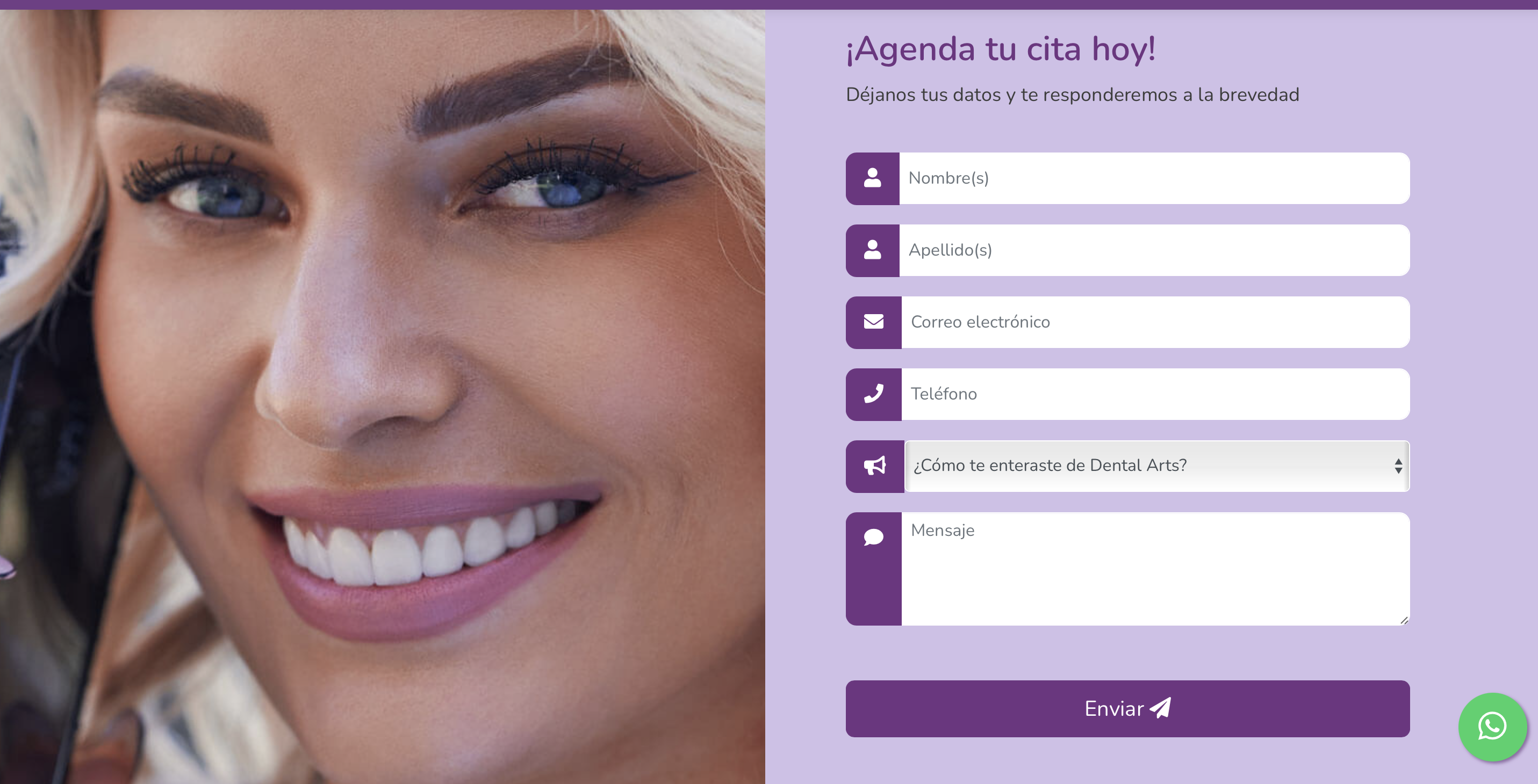Al entrar en el artículo vinculado a la publicación, nos dimos cuenta de que no tiene relación con la prostatitis, sino con tratamientos dentales. En el mismo observamos un número telefónico y un formulario que solicita datos personales, además de un logo de WhatsApp que, al hacer clic, dirige a un chat con un mensaje que dice: “Hola, quisiera obtener más información sobre Dental Arts”. Como ya lo hemos dicho anteriormente en elDetector, obtener datos personales es uno de los objetivos de los ciberdelincuentes.