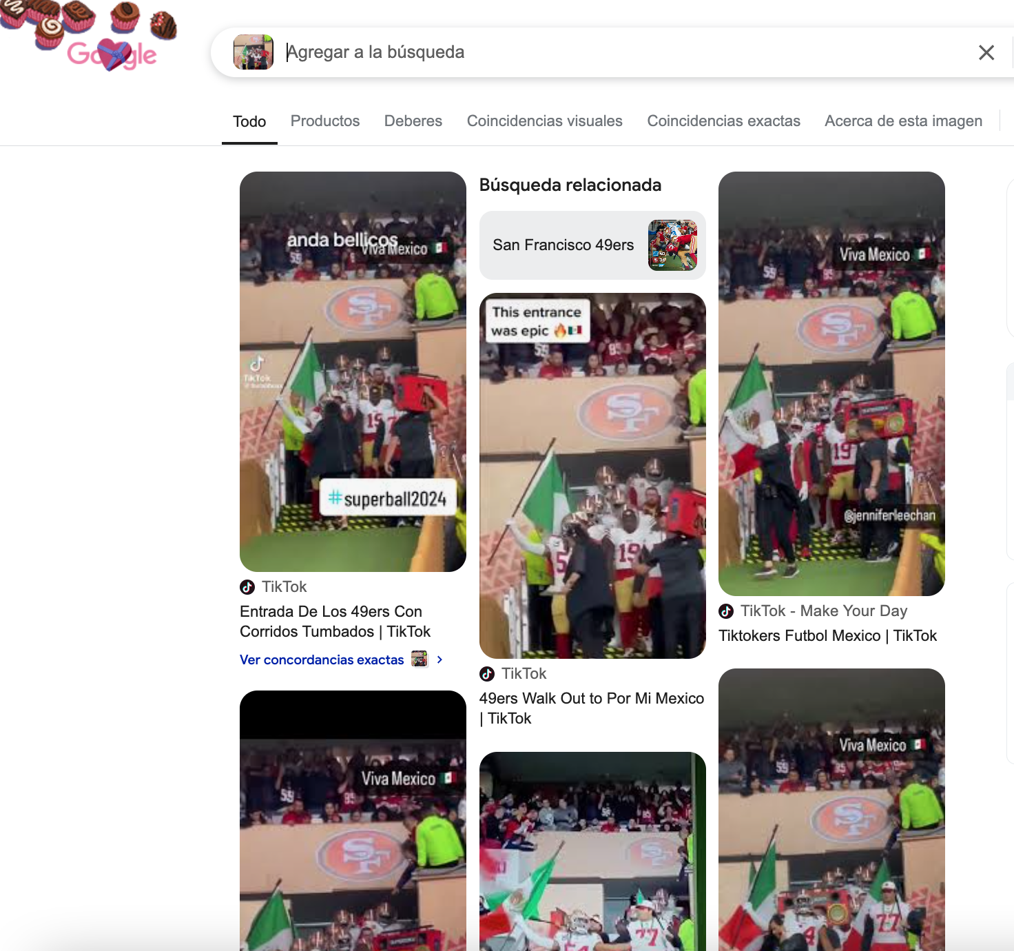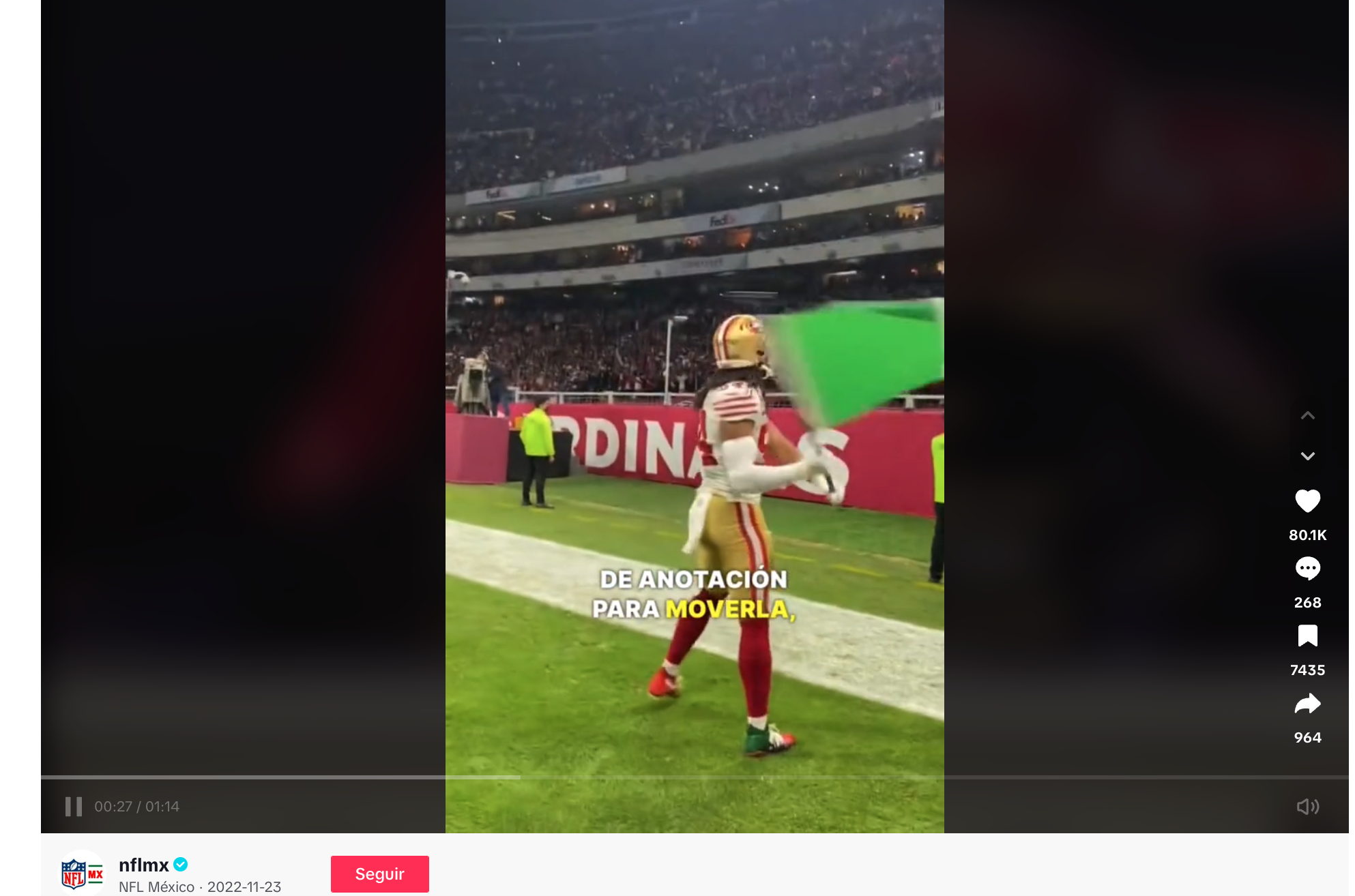 También realizamos una búsqueda con palabras clave y encontramos un video de la NFL en México en el que se señala que el 21 de noviembre de 2022, Fred Warner, jugador de los 49ers con raíces mexicanas salió del túnel a la cancha del Estadio Azteca cargando la bandera de México.