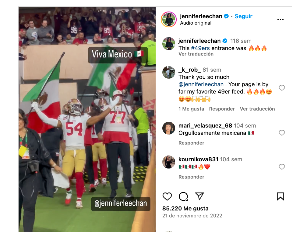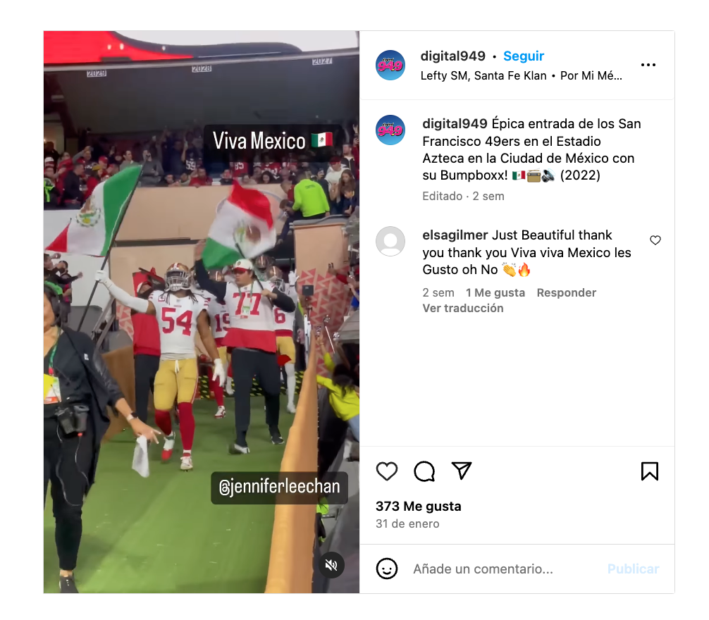 “Los 49ers de San Francisco muestran el apoyo a México, después de los problemas que se han presentado por las nuevas leyes de migración que ha impuesto el presidente Trump”, dice un mensaje en Facebook, que acompaña una grabación en la que sobrepuesta a las imágenes aparece la frase: “Los 49ers muestran apoyo a nuestro México. Viva México”.