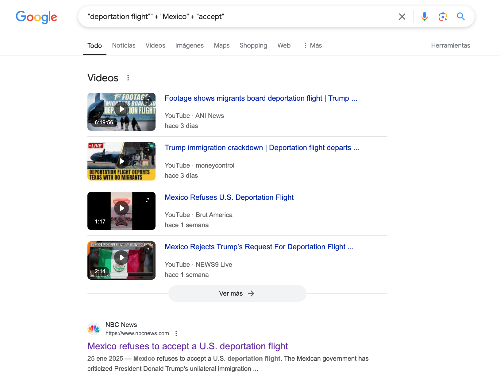 Desde elDetector hicimos una búsqueda con palabras clave en inglés en Google y encontramos que el 23 de enero de 2025, México negó el aterrizaje de un avión militar estadounidense con deportados a bordo, de acuerdo con un reporte de NBC News publicado el 24 de enero de 2025. La cadena, citando fuentes del Departamento de Defensa de Estados Unidos, informó que dos aviones C-17 con unos 80 pasajeros cada uno volaron a Guatemala, mientras que un tercer vuelo hacia México nunca despegó.