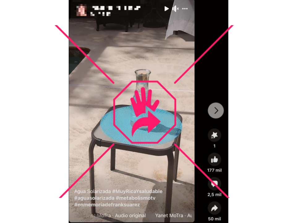 La grabación –en la que se observa una botella transparente llena de agua, tapada con corchos, sobre una mesa al lado de una piscina– viene acompañada de un audio que dice que al poner este líquido “dos o tres horas al sol” se van a notar dos cosas: que se pone “más espesa” porque “se carga con toda esa energía de los fotones” y que está “más sabrosa”.