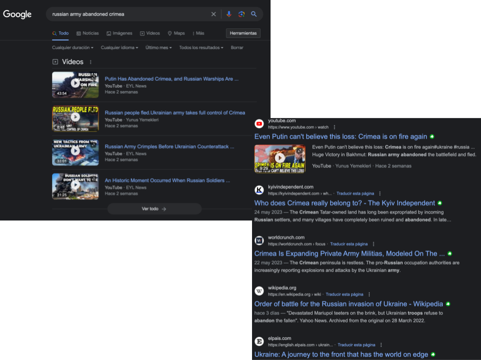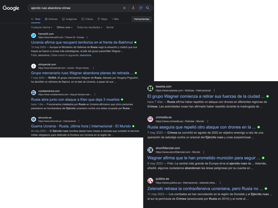 Google. Búsqueda con las palabras clave en español “ejército ruso abandona Crimea”. Consultado el 2 de junio de 2023.
