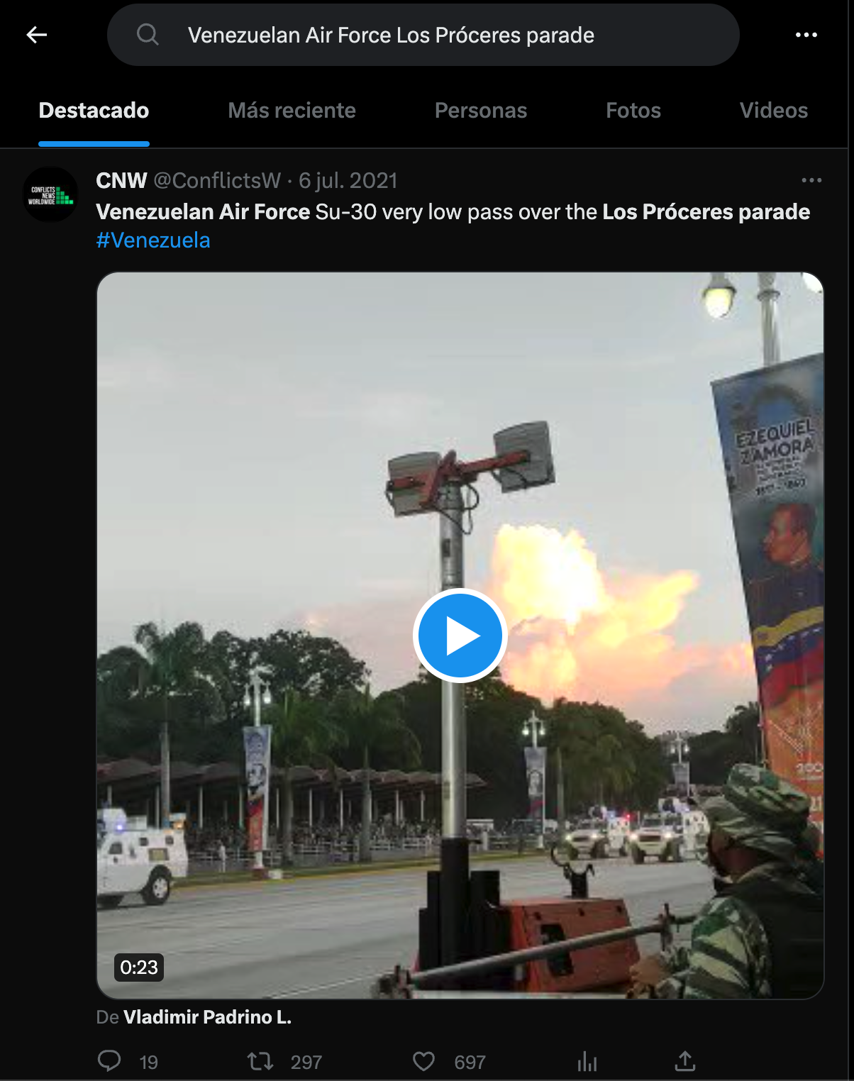 Twitter. Búsqueda con las palabras clave, en inglés, “Fuerza Aérea venezolana desfile Los Próceres”. Consultado el 11 de julio de 2023.