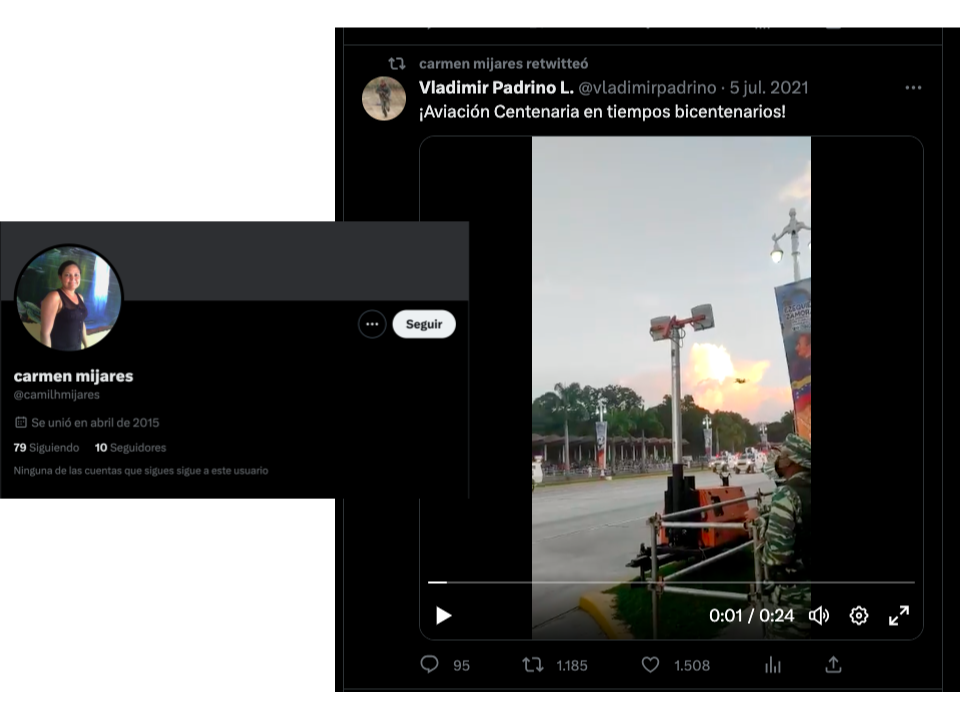 Una nueva búsqueda, en este caso en Twitter, con las palabras clave, en inglés, “Fuerza Aérea venezolana desfile Los Próceres” facilita un perfil en el que se aprecia la parte final del video analizado, cuando el avión suelta las luces de bengala, desde otro ángulo, y en el que se observa como la nave continúa su vuelo ascendente sin problemas.