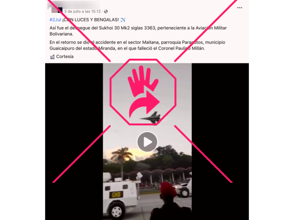 Es falso que el avión de combate que se observa en un video en Facebook sea el modelo Sukhoi de la Aviación Militar Bolivariana de Venezuela que se estrelló a 35 kilómetros (21,7 millas) de Caracas el 2 de julio y que le costó la vida a su piloto, como asegura el texto que acompaña a las imágenes. Esa grabación, en realidad, pertenece al desfile conmemorativo, de 2021, del 5 de Julio, Día de la Independencia del país y que se celebra anualmente. Al caza de ese video no le pasó nada.
