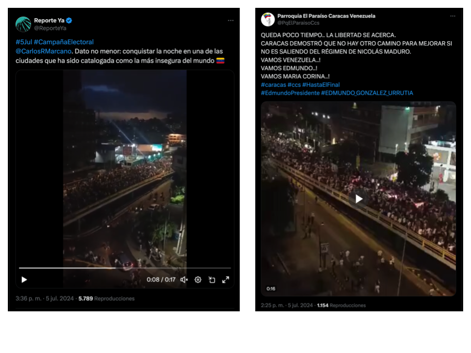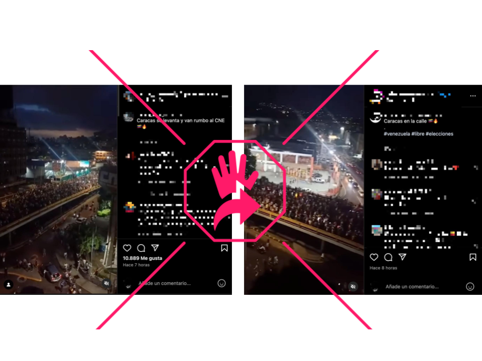“Caracas se levanta y van rumbo al CNE”, dice uno de los post. “Caracas en la calle”, dice otro. Ambos fueron publicados el 28 de julio, cuando Venezuela elegía su presidente para los próximos 6 años. Pero el video es anterior a los comicios, por lo que está fuera de contexto, y la marcha iba en dirección opuesta al lugar donde se encuentra la sede del CNE, en el centro de Caracas.