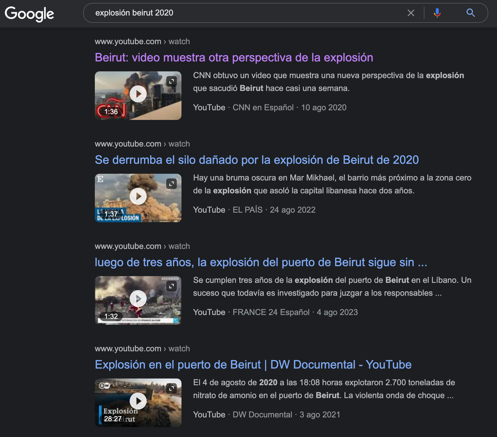 Una nueva indagación en Google, esta vez con las palabras clave “explosión beirut 2020”, da entre sus resultados un video de CNN en Español, subido al canal de este medio en YouTube el 8 de agosto de 2020, que abre con las imágenes del video analizado y que se titula “Nuevas imágenes de la explosión en Beirut y más información desde el Líbano”.