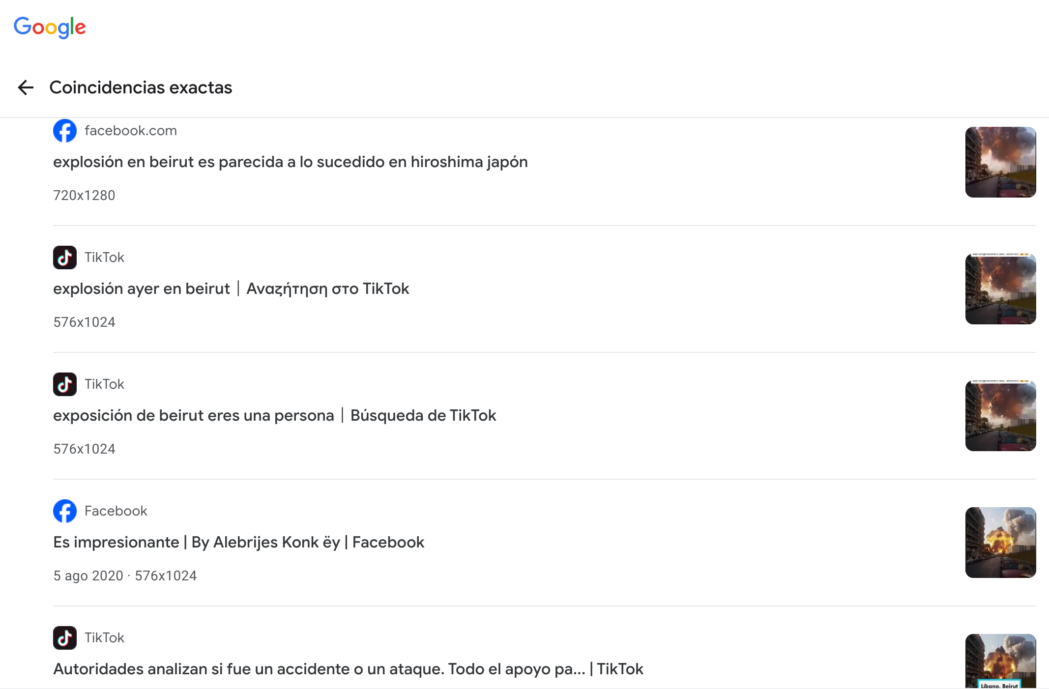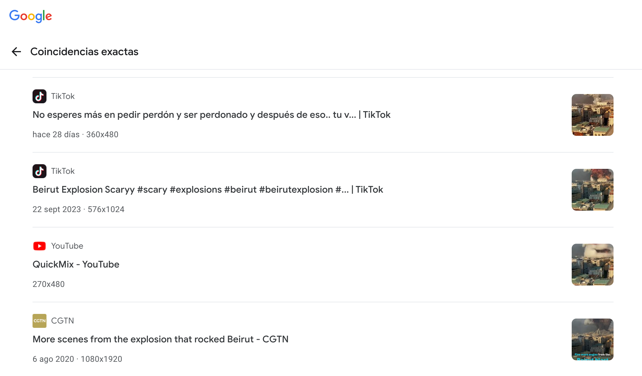 Una búsqueda inversa de imagen en Google, a partir de una captura del primer clip, en el que se aprecia al inicio la explosión al fondo de una calle con vehículos estacionados a ambos lados entre los que destaca uno rojo a la derecha, nos lleva, por ejemplo, a una publicación en TikTok del 4 de agosto de 2020 que en su descripción tiene las etiquetas “Beirut” y “explosión”, esta última en inglés.