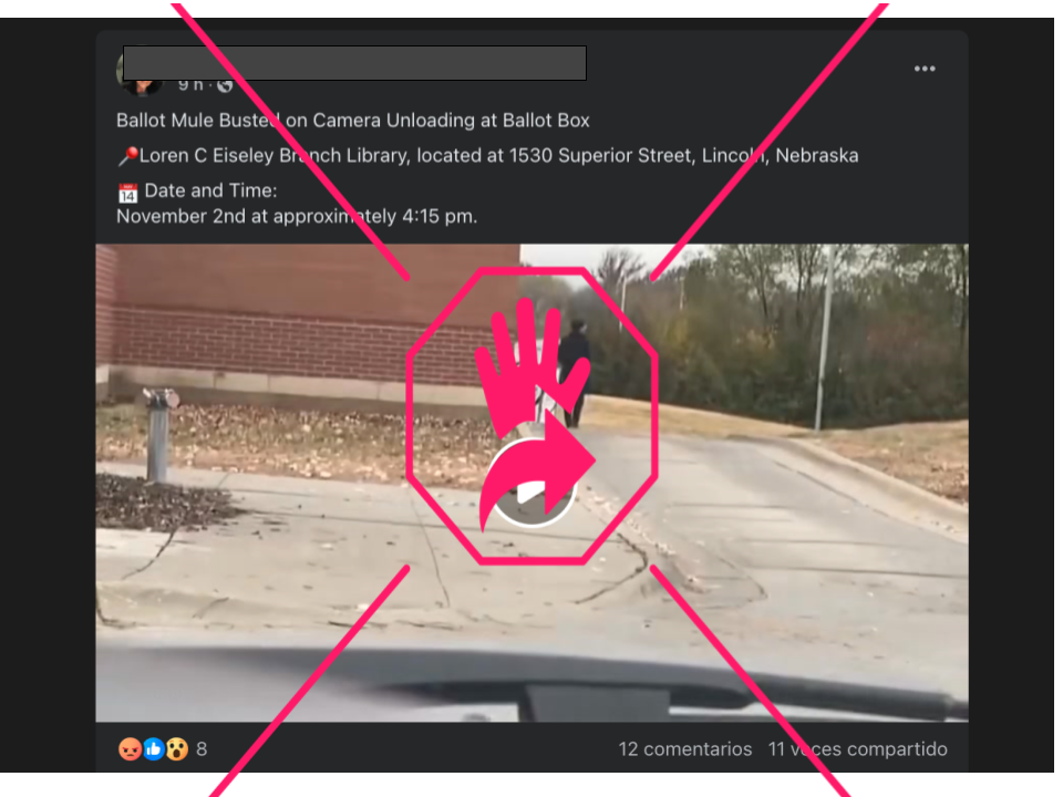 “ Una mula de boletas [término para describir a personas que supuestamente recogen y depositan papeletas de votación ilegalmente] es captada en cámara descargando boletas en una urna. Biblioteca Loren C Eiseley Branch, ubicada en 1530 Superior Street, Lincoln, Nebraska. Fecha y hora: 2 de noviembre aproximadamente a las 4:15 pm”, dice un mensaje en inglés publicado en Facebook este 5 de noviembre de 2024.