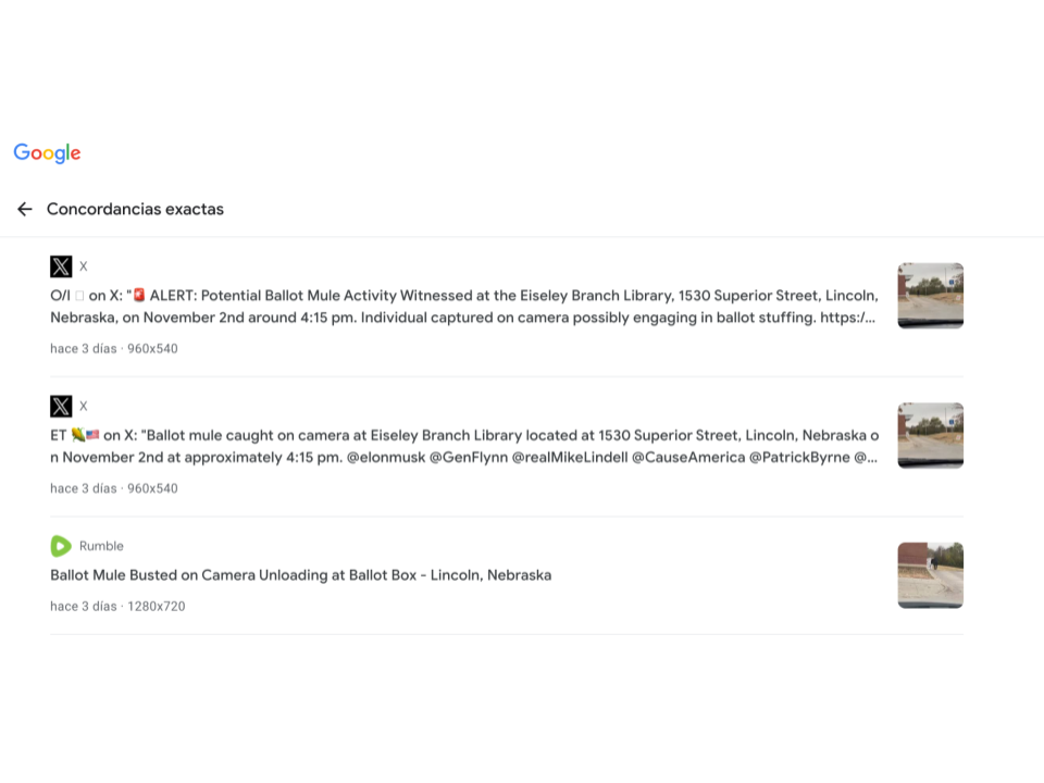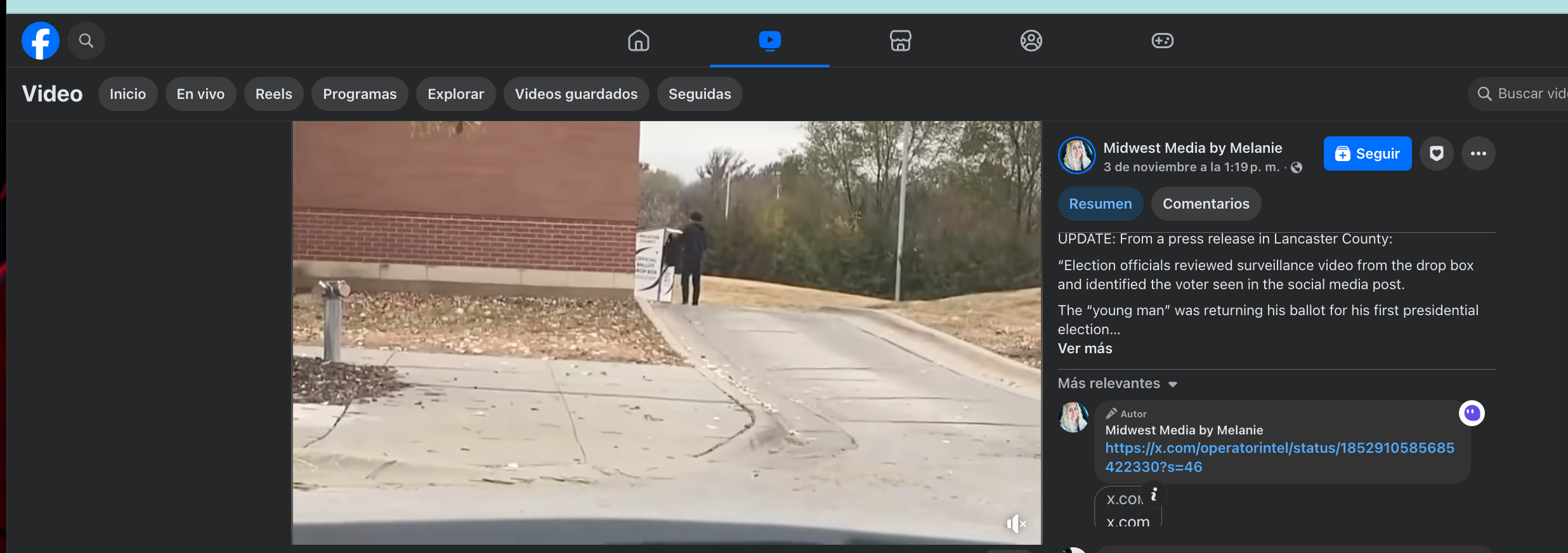 Desde elDetector hicimos una búsqueda inversa de imágenes en Google Lens y encontramos varias publicaciones con el video y la falsedad sobre la “mula de boletas”. Una de ellas es una publicación en Facebook que dice: “Actualización de un comunicado de prensa del condado de Lancaster: Funcionarios electorales revisaron el video de vigilancia del buzón e identificaron al votante que aparece en la publicación en las redes sociales. El joven estaba devolviendo la papeleta de su primera elección presidencial y se tomó una selfie”.