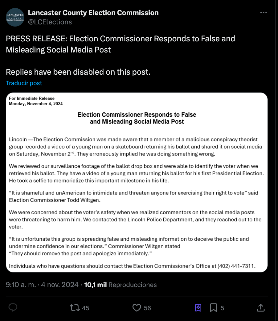 Hicimos una búsqueda en la web del condado de Lancaster y posteriormente revisamos el site de su c omisionado electoral. Tras revisar sus redes sociales encontramos que una publicación fijada en su cuenta de X (antes Twitter) del 4 de noviembre de 2024 incluye el comunicado íntegro al que hace referencia la actualización sobre la publicación que desinforma..